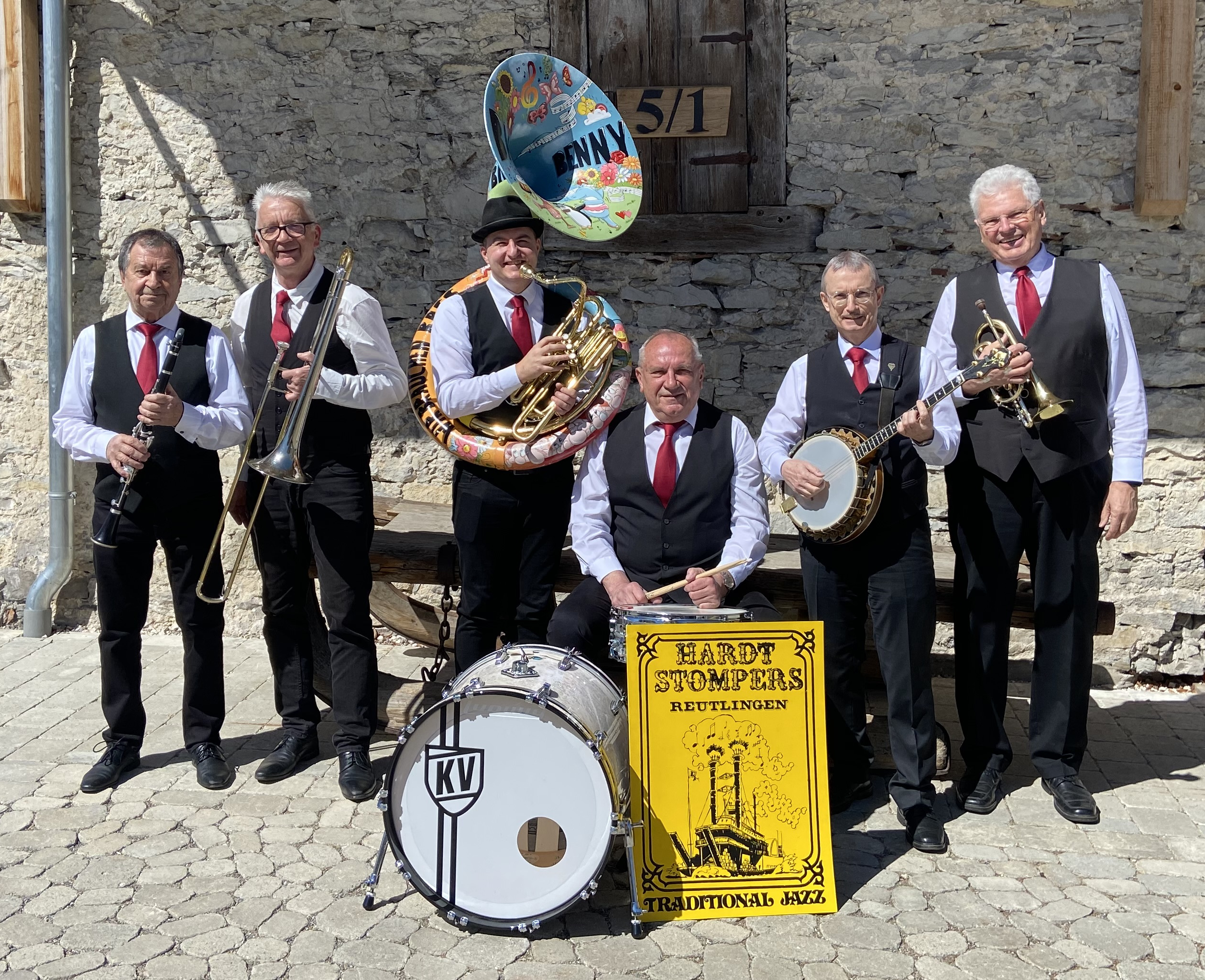 Eine musikalische Verbeugung vor der über 100jährigen Tradition des Jazz in Verbindung mit einem stimmungsvollen Frühschoppen, mit Weißbier und Weißwürsten zum Jahresauftakt, gehören für den nun auch schon 50jährigen Jazzclub zu den liebgewordenen Traditionen. Und wer wäre dazu besser in der Lage, wie die sechs „gestandenen Mannsbilder“ der „Hardt Stompers Traditional Jazzband“, die im Kern nun auch schon seit 45 Jahren den traditionellen Jazz pflegen. Hervorgegangen aus einer Lehrerband des Reutlinger Bildungszentrums im Gewann „Hardt“ zelebrieren die mittlerweile handverlesenen Jazzer aus dem ganzen Schwabenländle stilsicher den traditionellen Jazz aus der New Orleans Ära. Die traditionelle Combobesetzung mit Klarinette, Trompete, Posaune, Banjo, Tuba und Schlagzeug, gelegentlich auch alternierend mit Gitarre und Kontrabass, bietet gefälligen und unterhaltsamen Oldtime Jazz, gelegentlich auch mit karibischen Einflüssen oder in Standards mit unterlegten deutschen Texten. Ebenso fachkundige wie launige Ansagen zum Repertoire gehören zu den Kernkompetenzen der Gute-Laune-Truppe.